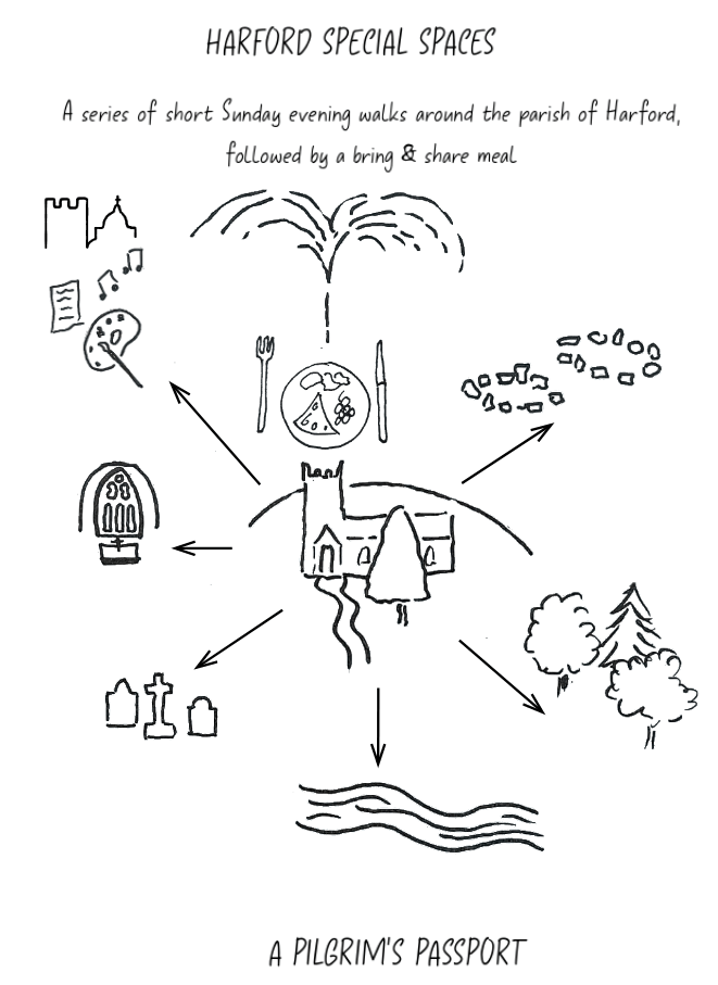 Historically pilgrims would retain some sort of tangible token to remind them of their pilgrimage. These sometimes took the form of badges, or flasks of oil or holy water. This is why we’ve given you your pilgrim’s passports. You’ll see that there is an empty space for each event, which you may want to use to fill with something – perhaps just a picture or a word – that records your response to that day’s outing. At the end of the series we will have a creative day and a celebration at the church that we hope will give you an opportunity to create something that reflects your journey in these months: your own token to remind you of Harford’s special spaces.
