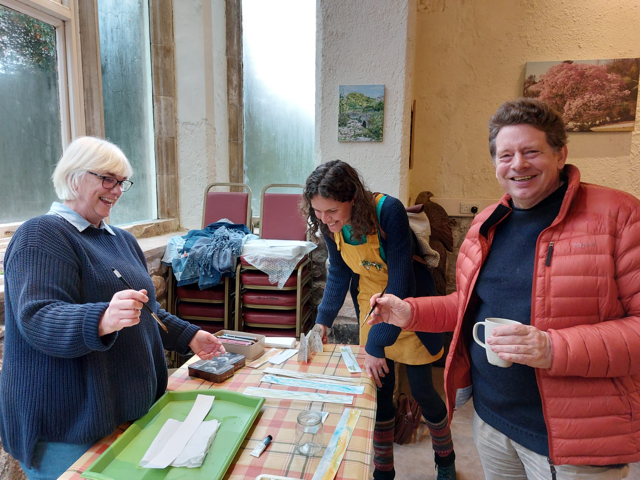 We started the day with an audio-visual presentation of the walks we had done, prepared by a keen amateur photographer in our number, which reminded everyone of the places we had visited and introduced the idea to anyone who hadn’t been on the walks. Then everyone was invited to try out whichever artistic station took their fancy.