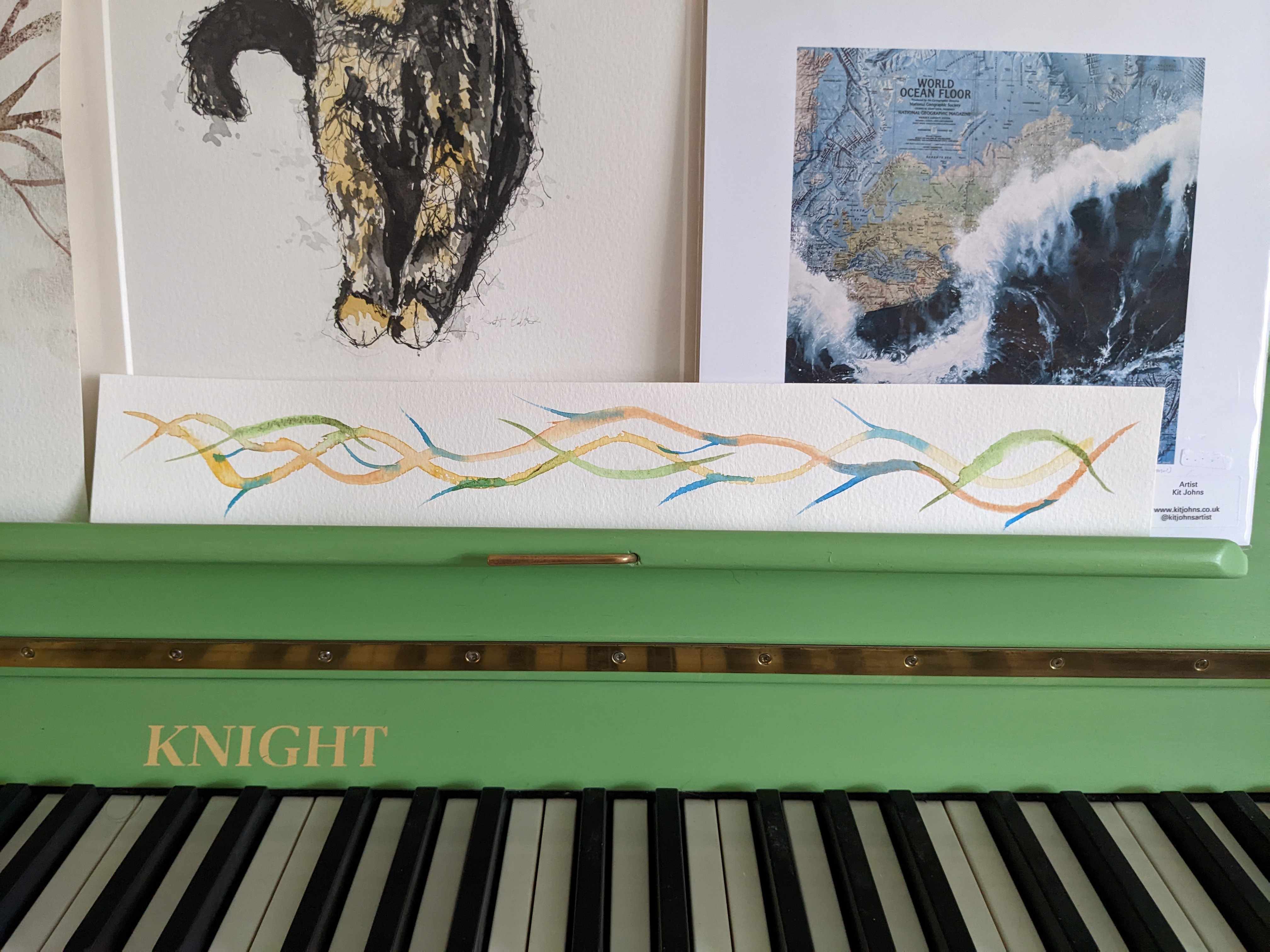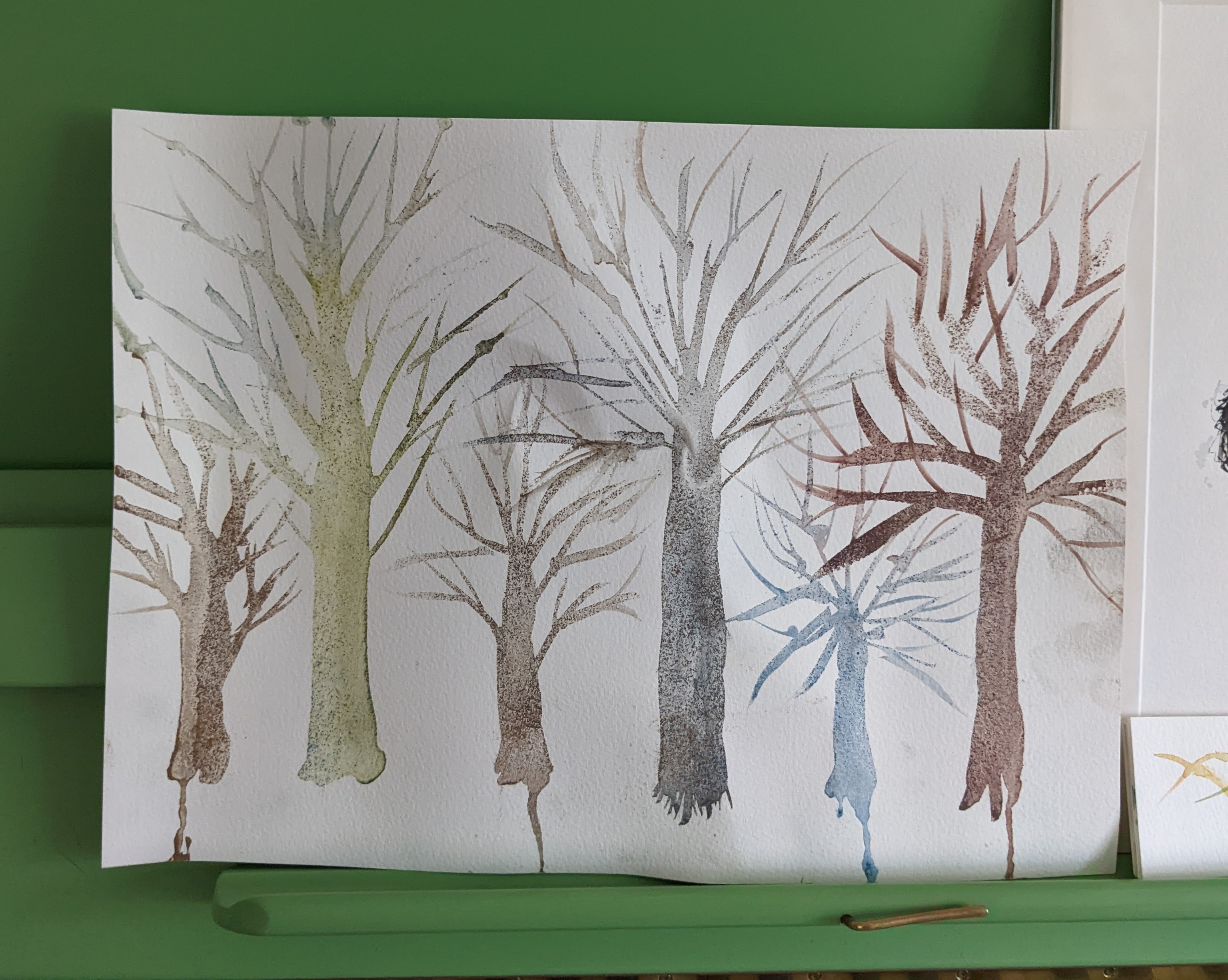 I decided to keep my watercolour trees and river because I was quite delighted with them! They are currently on display on the piano (a temporary art gallery!).