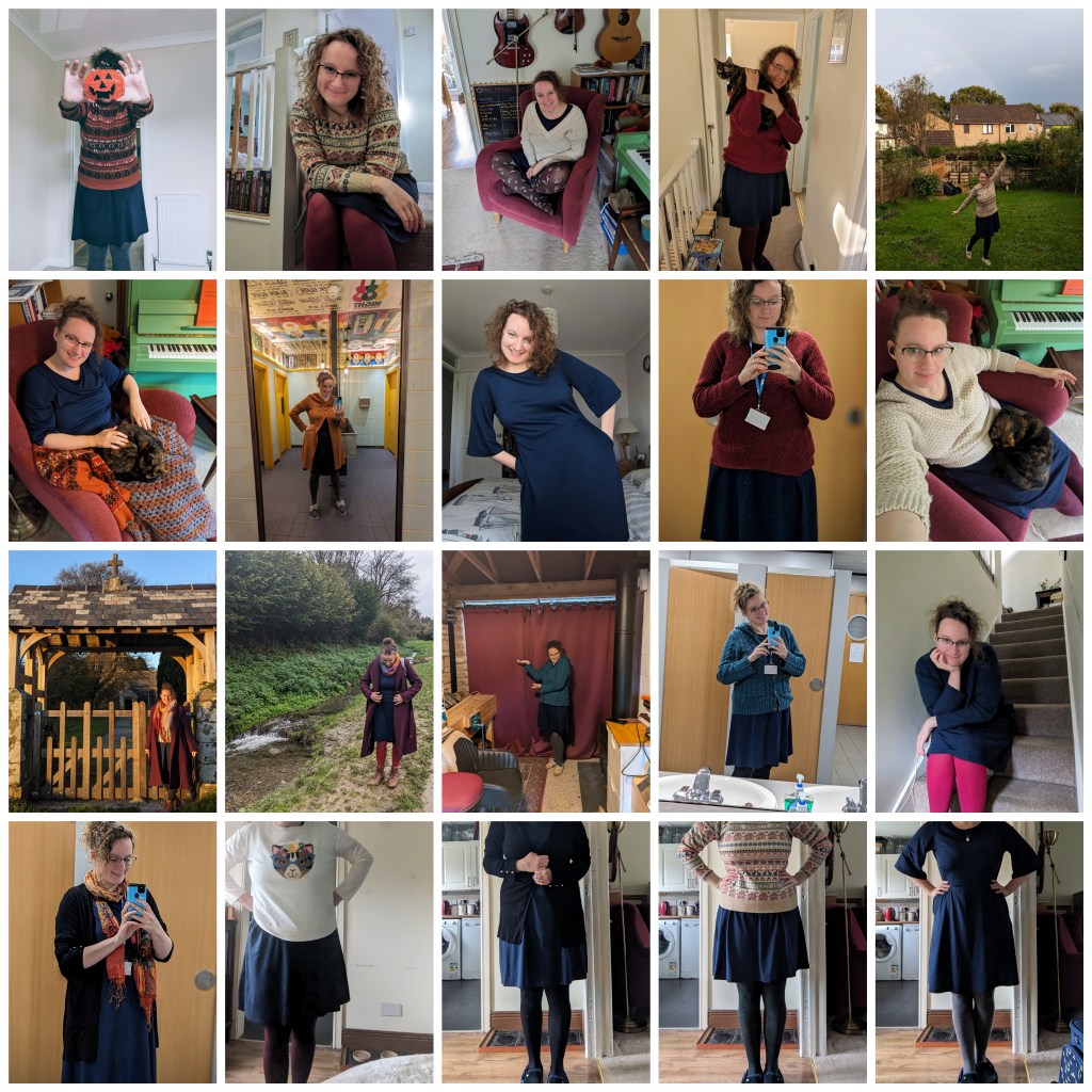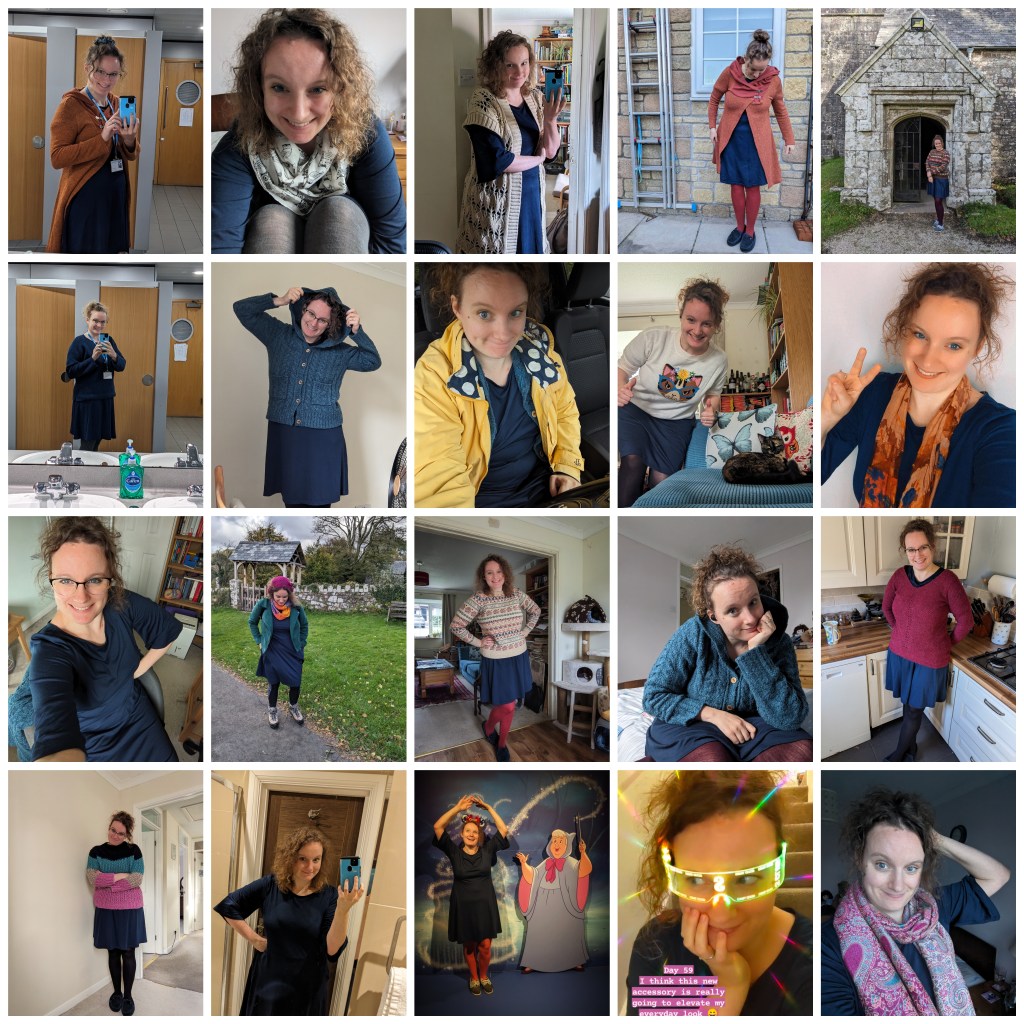 The choice of dress was quite easy: I wanted something with sleeves and with a waist to flatter my body shape, and I opted for blue as a favourite colour and one that would match my eyes. I started the challenge on 1st September and, many selfies later, finished today on 9th December.