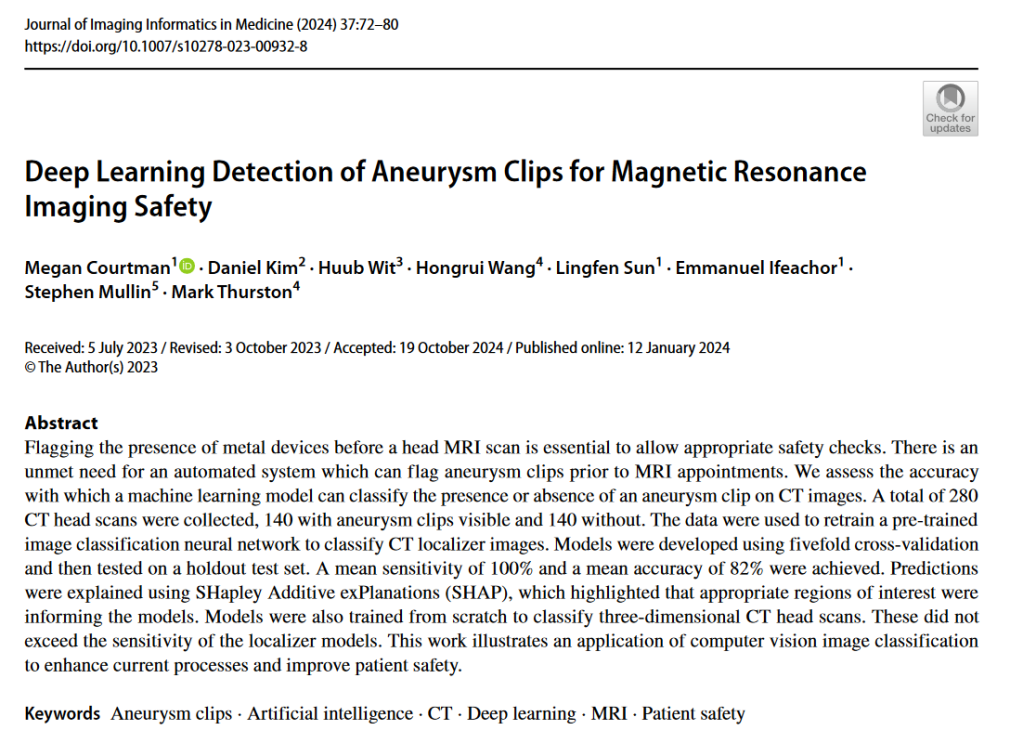 And here is a paper that I published on using AI to detect metal devices for MRI safety (access full article here):